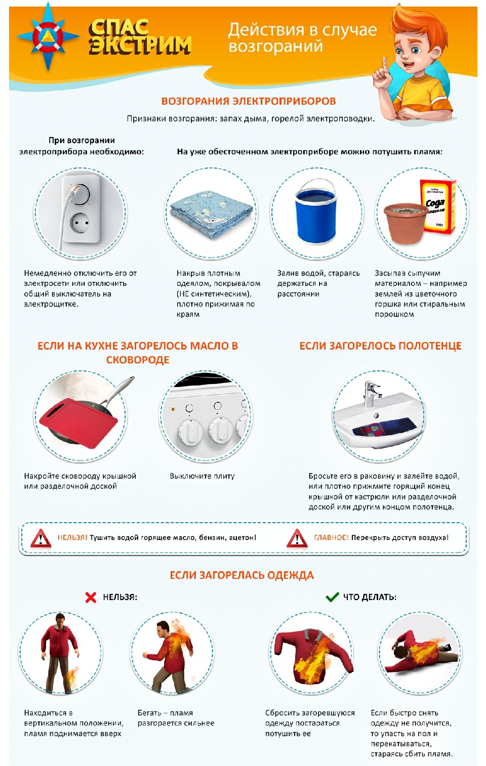 Очень важно запомнить, какие именно способы подходят для тушения тех или иных предметов, так ты сможешь быстрее сориентироваться, если окажешься в сложной ситуации. Например, если горящую мусорную корзину можно легко потушить водой, то включенный электроприбор ни в коем случае заливать водой нельзя, может произойти короткое замыкание. А горящую на человеке одежду лучше тушить, катая пострадавшего по земле – это уменьшит доступ кислорода, и огонь погаснет.